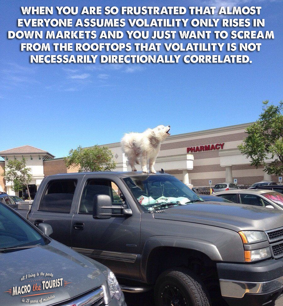 No doubt, that on average, that conclusion is correct, but how many times have we seen stable relationships completely thrown out the window? It would be just like the Market Gods to punish the vol sellers by having both volatility and stock prices shoot higher in the coming quarters. Those vol sellers would lose on both sides. The short volatility strategy will end up being a loser, while the synthetic short of not being long equities would also be a drain on the portfolio. Not a prediction, but it might be just the kind of out-of-the-blue outcome that hurts the most market players. And if there is one thing that I have learned over the years, it’s that markets often end up going to the point of maximum pain for the most amount of players. Higher volatility and higher stocks might end up being that sort of unexpected outcome.
