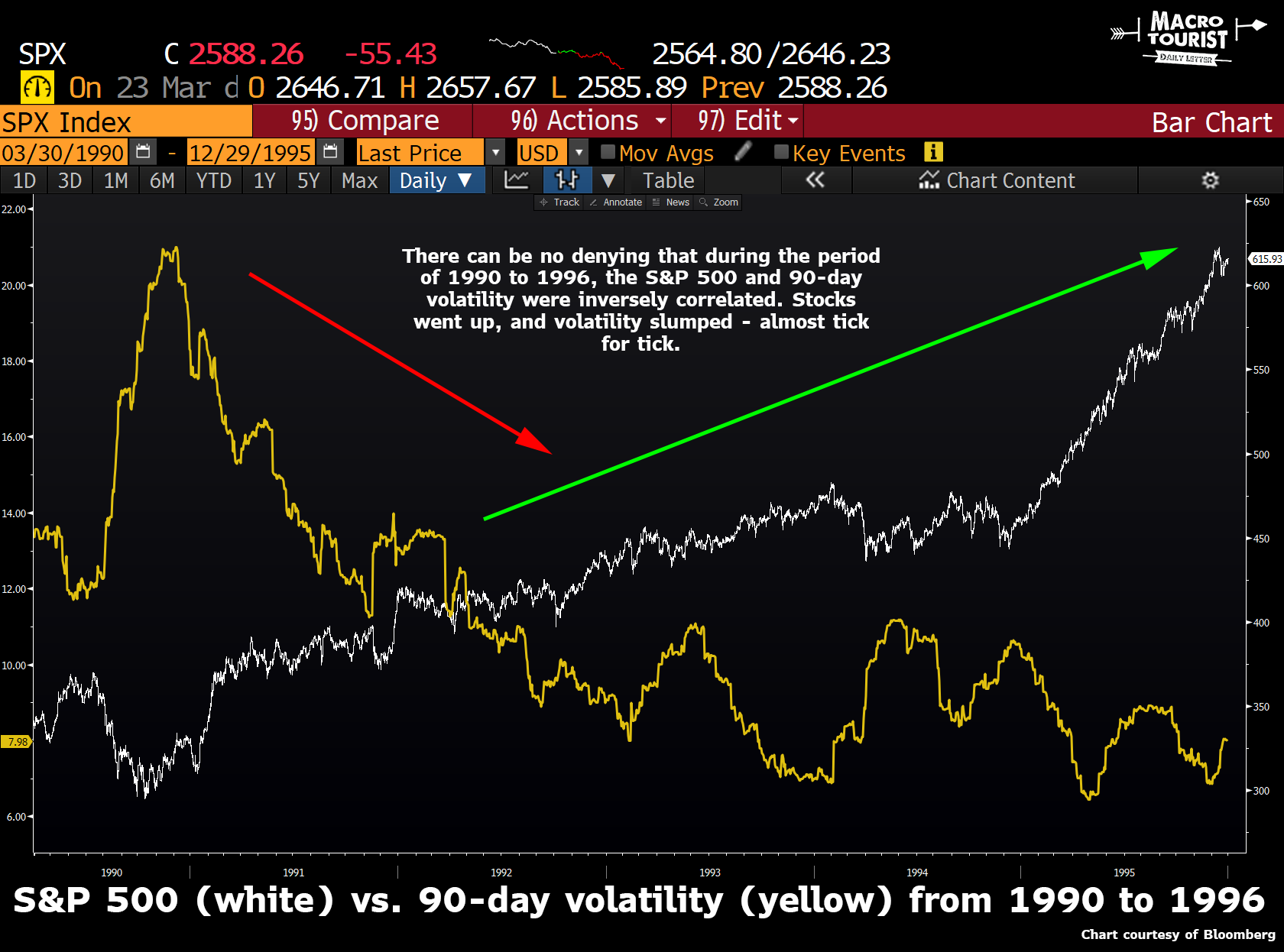 During this time the S&P 500 more than doubled, but so did the realized volatility. 90-day historical volatility went from 8% to spiking above 25%, with the average firmly pushing 20%.