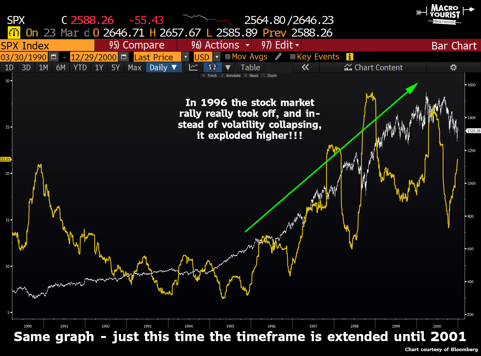 But what happened from 1996 to 2001? Well, stock markets went even higher, so volatility must have collapsed, right? Or at least stayed at depressed levels?