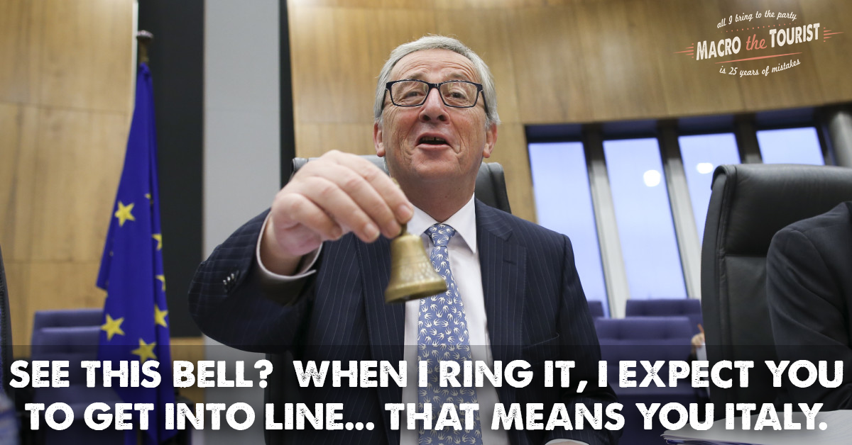 You see, Jean-Claude is upset that the Italians are not adhering to EU rules about the size of their deficit. He wants them to get into line and balance their budget. The Italian coalition government has tabled a budget with a 2.4% deficit as a percentage of GDP - much higher than allowed under EU rules. Given the EU’s staunch opposition to deficits of this size, they have increased rhetoric in attempt to force the Italians to back down.
